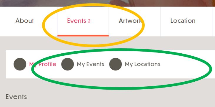 If you are having a special event related to your art, you can add it to your profile. Your special event will also appear on the main Special Events page. To add or manage your events, click on your profile icon to go to your main profile page. You will see a tab called “EVENTS”. Click on the tab.