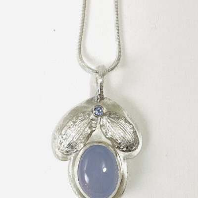Blue chalcedony and faceted tanzanite pendant in sterling silver by Sudha Irwin February 3, 2025 1331 4th Street, San Rafael, CA 94901 Contact For Pricing