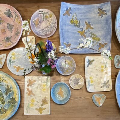 Save the Bees series : Bee themed ceramic items. by Antonia Tuppy Lawson February 11, 2025 San Rafael CA Contact For Pricing
