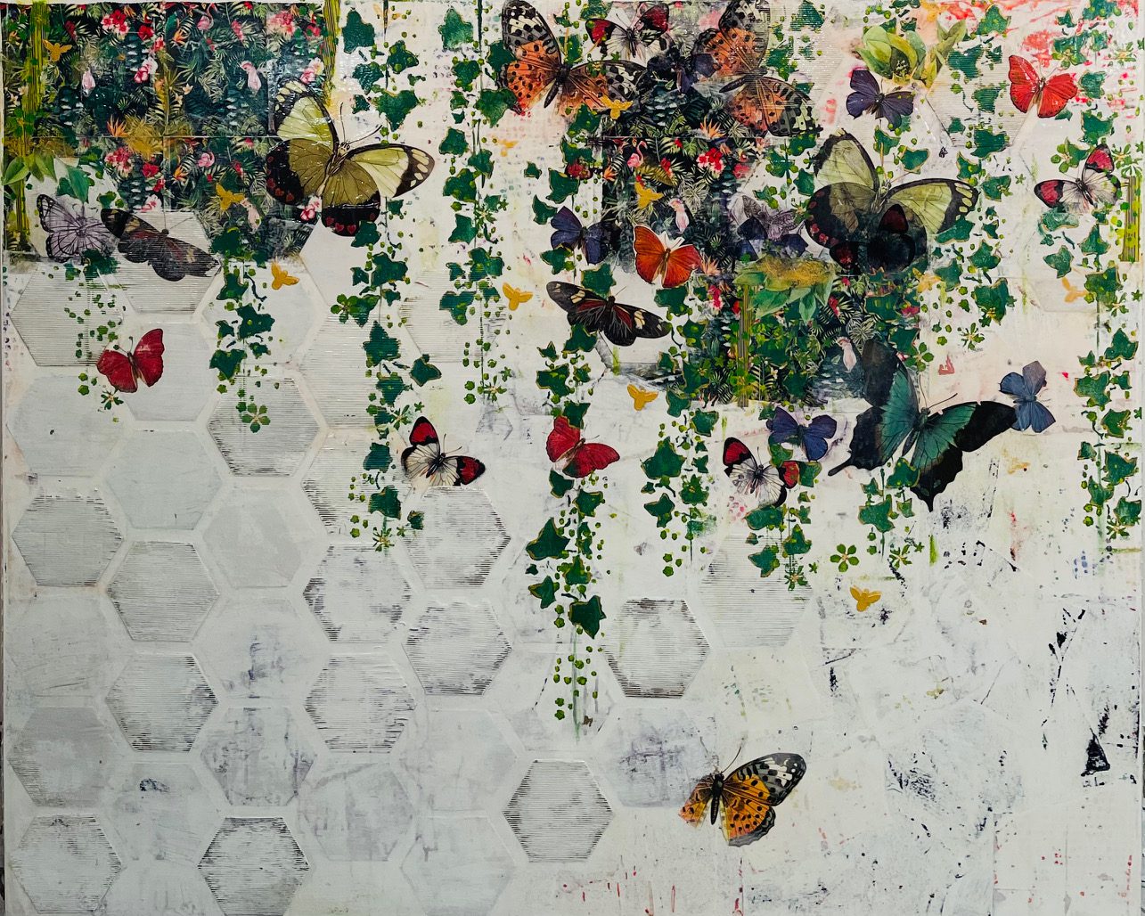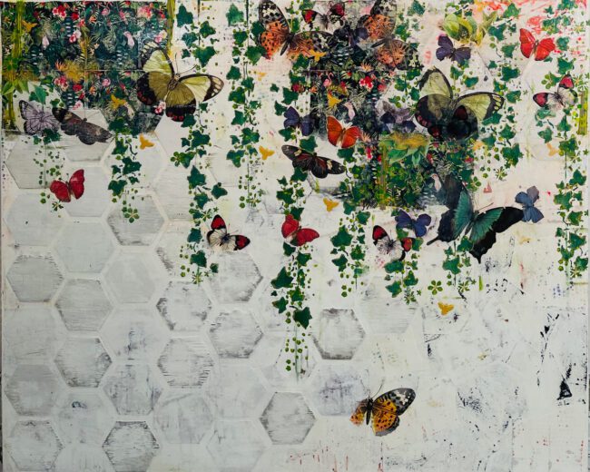 Acrylic paint, paper, packaging pieces, fabric, image transfers, and glitter on panel. 44″ x 54″ x 2″