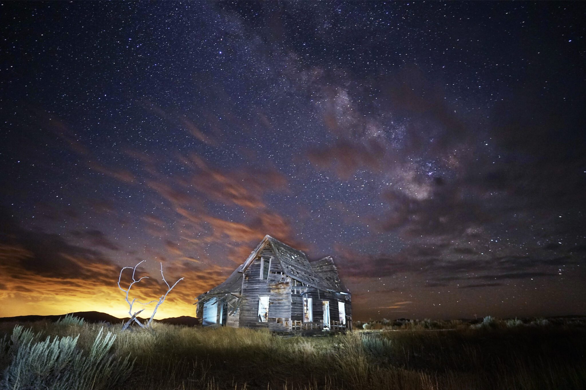 Taken in Sierra Valley, North of Lake Tahoe. The light on the horizon is light pollution from Reno, not the sunset.