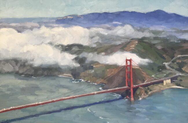 On a summer Sunday morning, I flew with my husband over the beautiful Golden Gate bridge. The silvery clouds flying over like fairies. Taking my breath away!