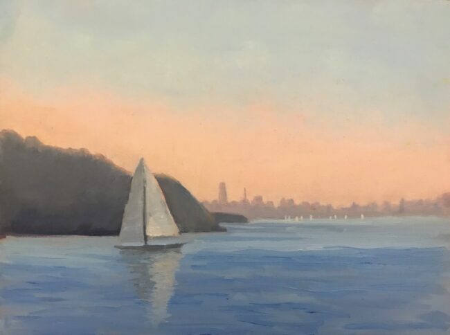 Painted in plein air from the end of Tiburon Blvd. in Tiburon. It is a 9″ x 12″ oil painting and framed with a black and gold frame.