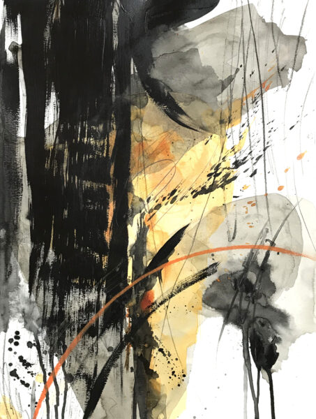Elegant abstract painting with a strong gestural black with an accent of yellow. Work is on Mixed Media paper, 24″ x 18″. It is “float” mounted on a white mat. Framed in an elegant bleached wood frame. Framed size: 31.25″ x 25.25″.