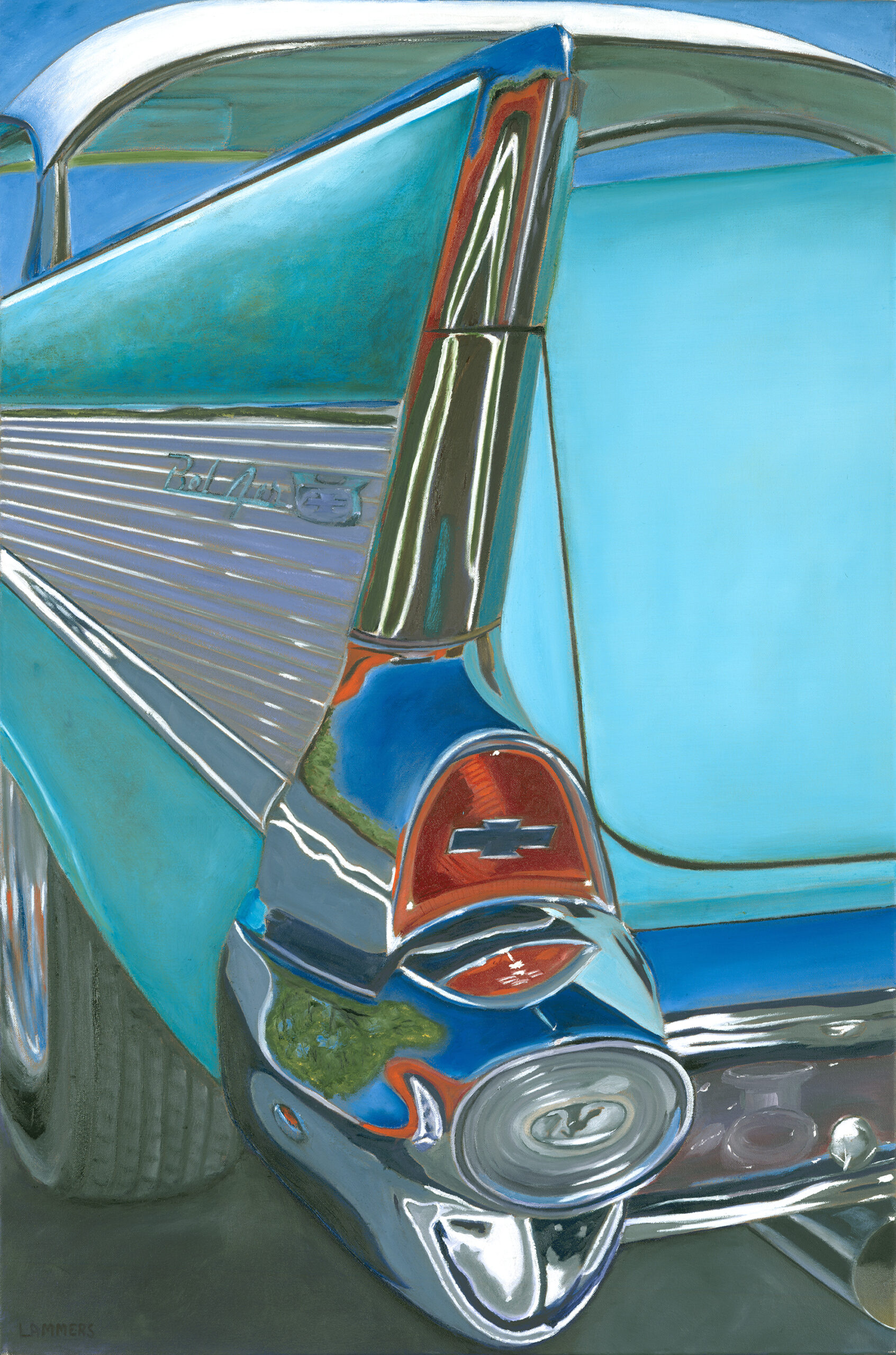 Original was a yellow Bel Air seen at a car show in Bon Air Shopping Center Greenbrae CA. I watched as a turquoise Bel Air drove past me in San Anselmo and decided to go turquoise. 24″36″ Oil on canvas.
