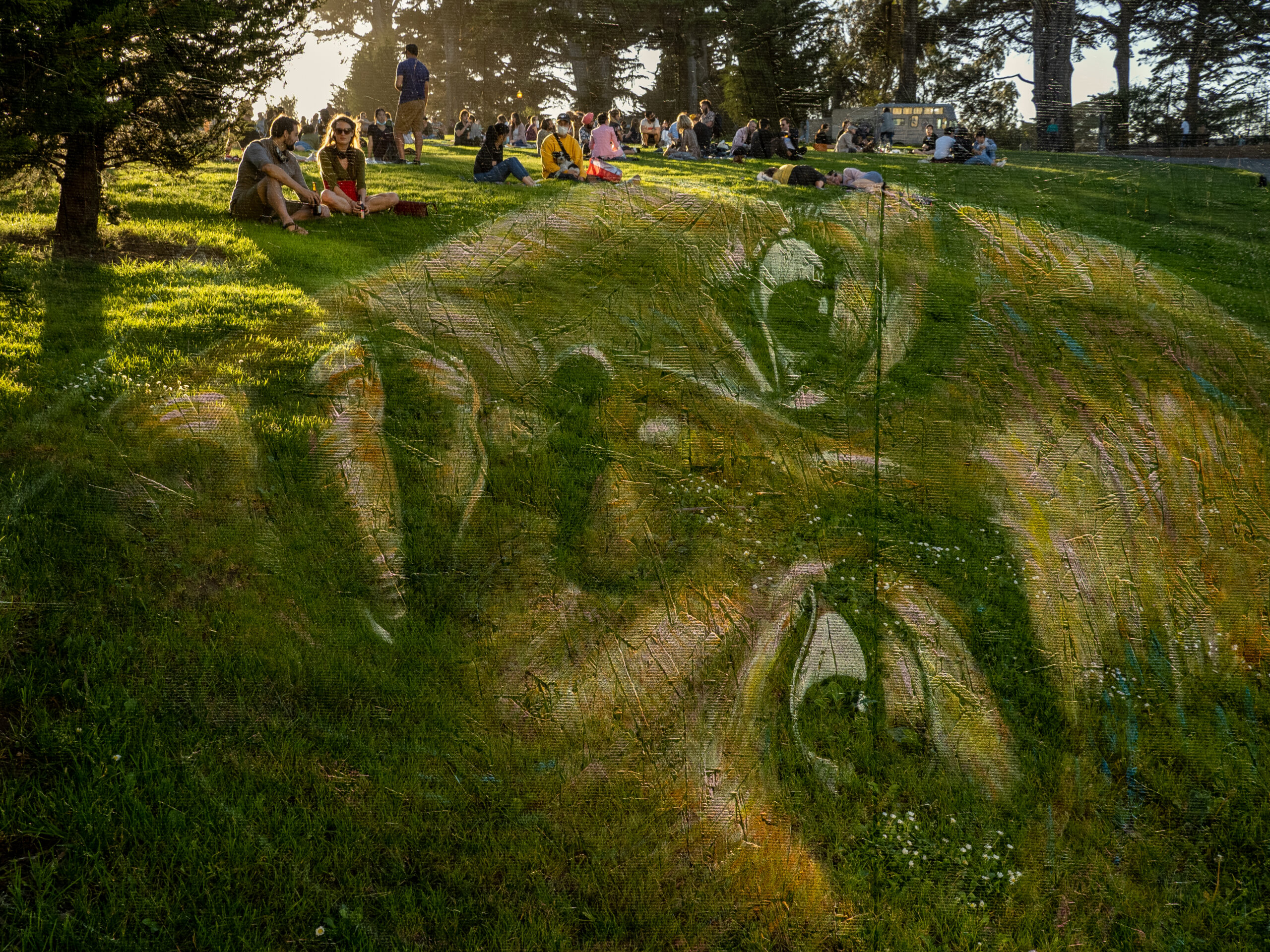 In-camera double exposure; September 25th 2020. Outdoor socially distanced socializing in Alamo Square Park. Portrait on plywood by Wesley Cabral. Part of the series ‘San Francisco 2020s’ in which I merge San Francisco street art with street scenes to create a unique memory of the decade.