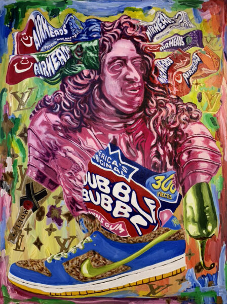 A fun vibrant and colorful painting that features a mix of realistic and fantastical elements, reflecting a playful and satirical exploration of royal court portraiture.
