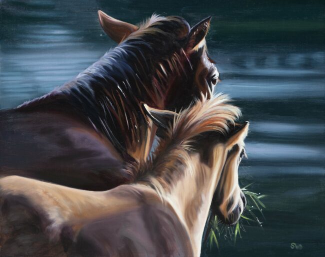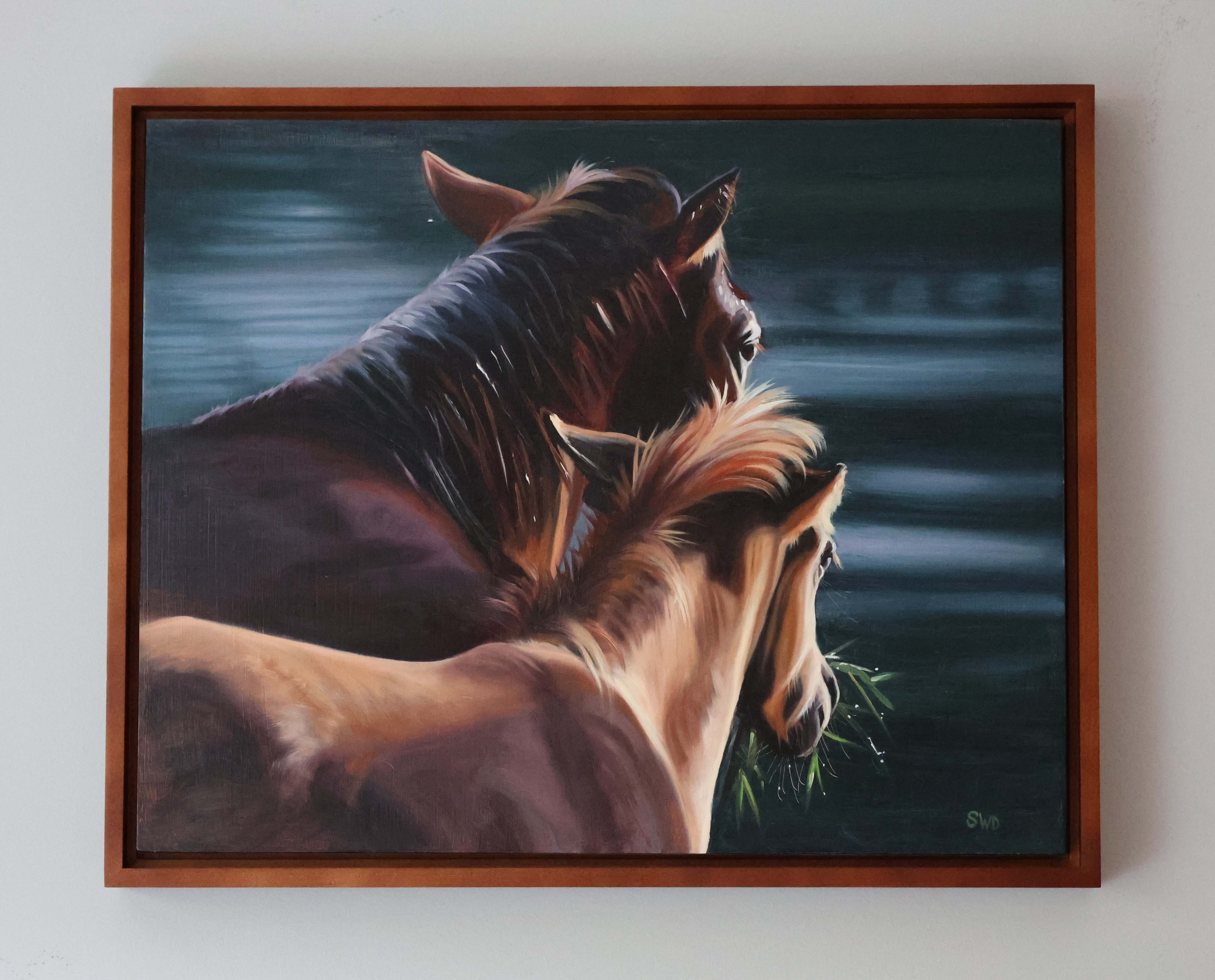 20″ x 16″ oil on cradled wood board in a mahogany wood floater frame.