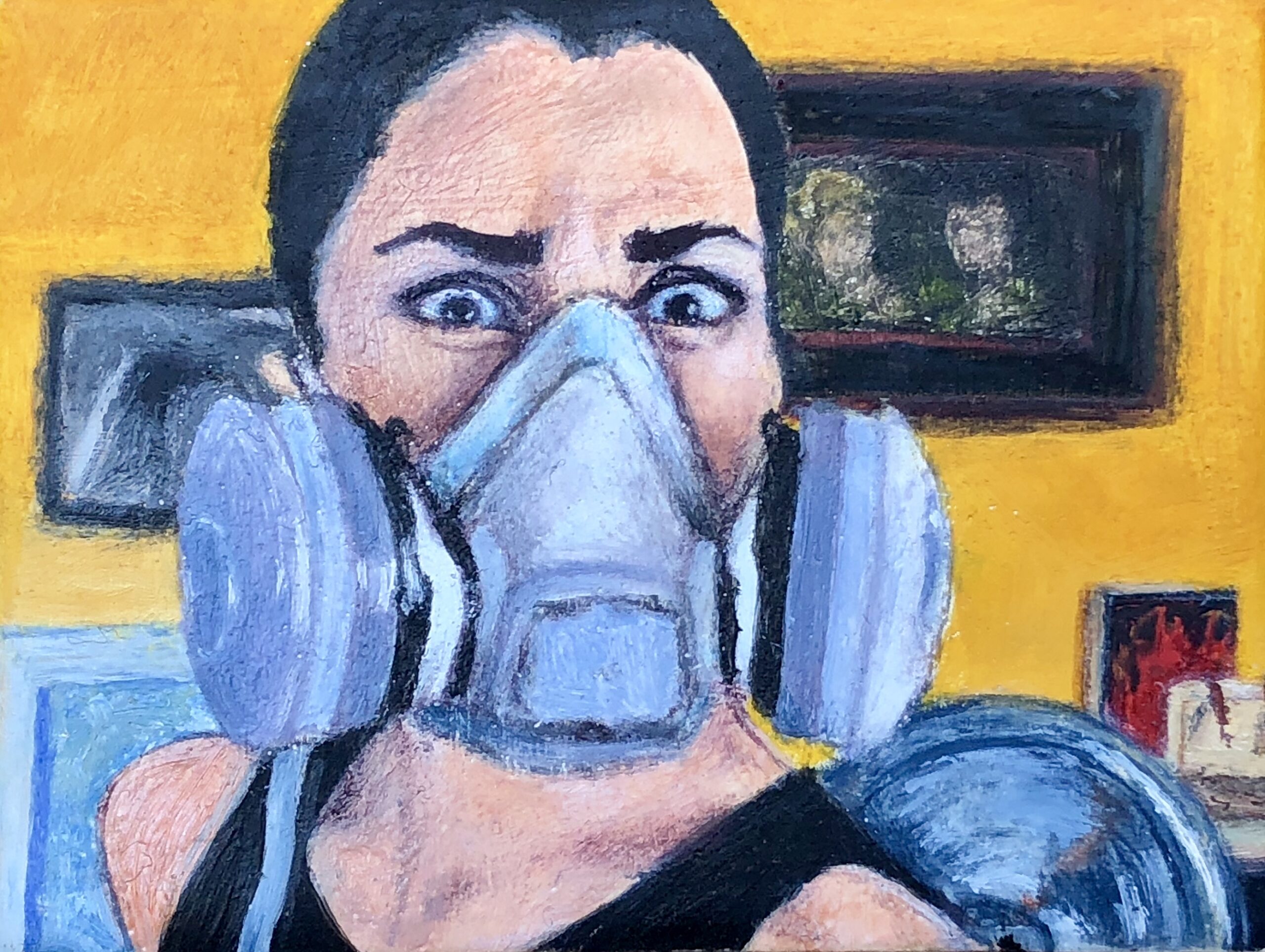 Miniature Self-Portrait with an industrial respirator in my art studio