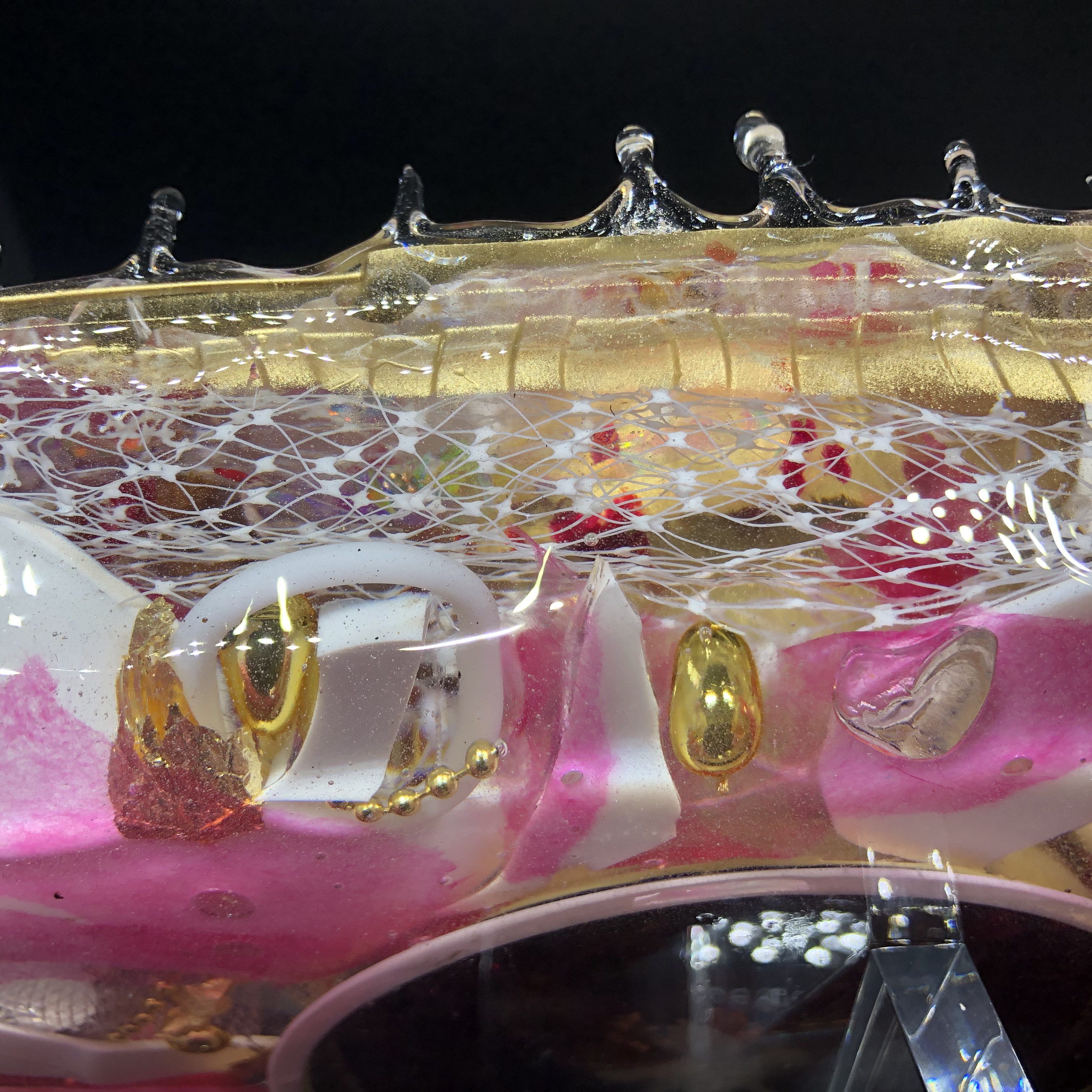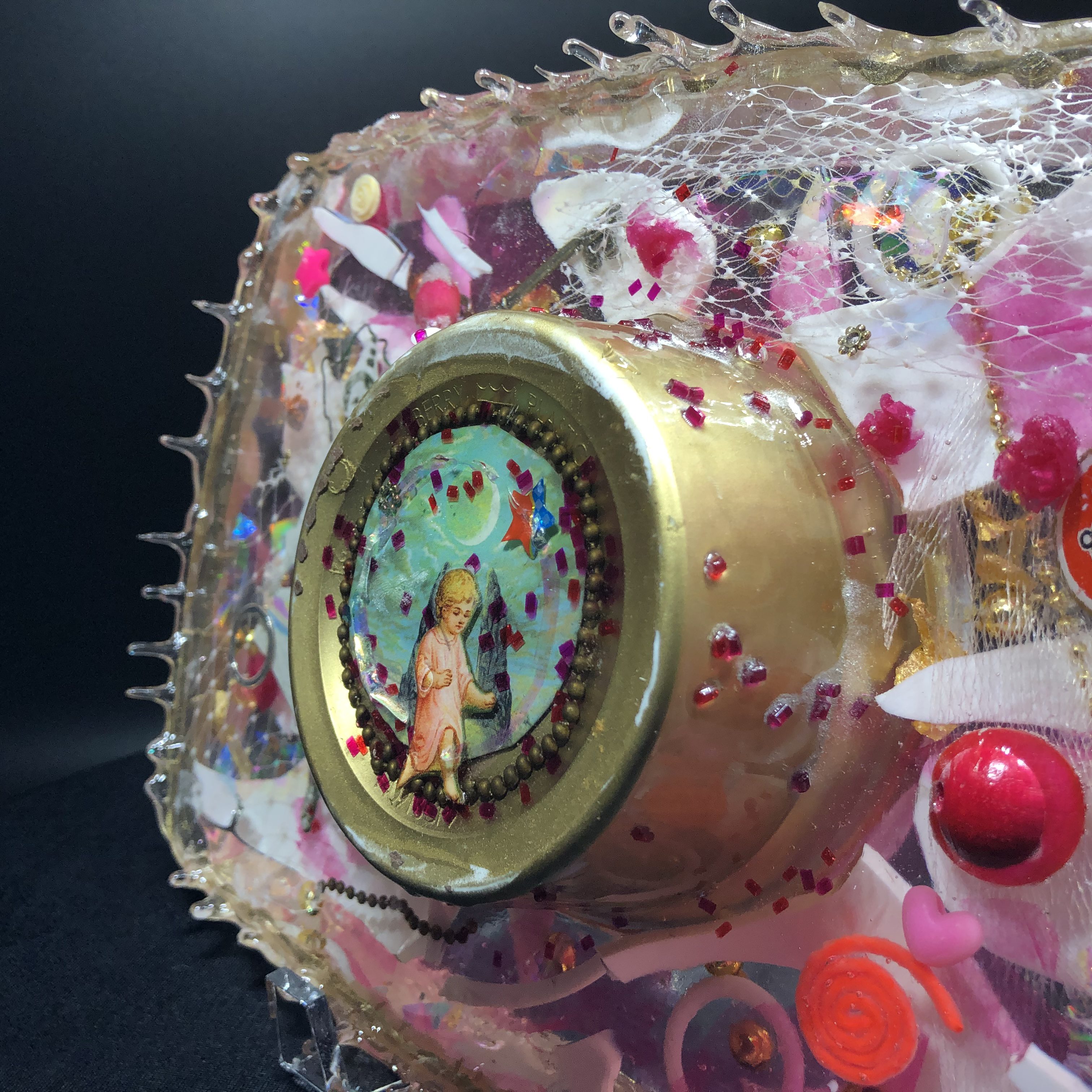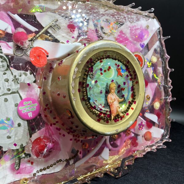 Acquired and found objects, paper collage, epoxy resin.