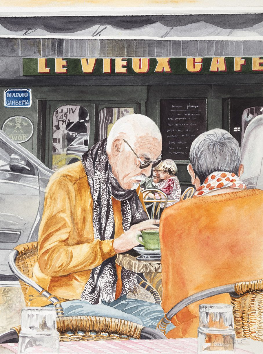 A couple is having coffee in the afternoon in the town of Sete, south of France. This painting was shown at the PEOPLE exhibit in Sebastopol in October of 2023.