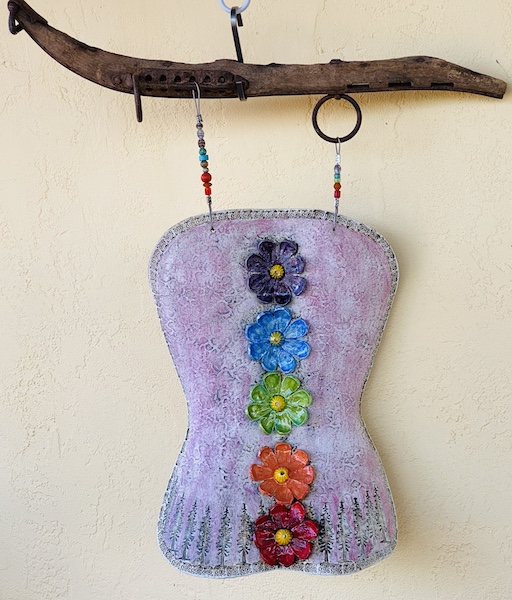 My BODY ART series features different parts of the female torso whose shape and form inspires my work. The female body becomes the foundation upon which I build by sculptures, using textures or paint to reveal deeper meaning. My YOKED BACK series focuses on the multitude of stresses or duties a woman’s back endures. The horse harnesses represent the concept of beasts of burden. Being the Backbone of Traditional to modern families a woman’s back is not only beautiful but full of strength and resilience. California Dreaming, Suspended Koi and Peony Princess are all part of this series.