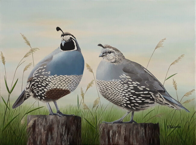 California Quail Pair by Karen Robinson Published: May 2, 2025 (8 months ago) Contact For Pricing CategoryPRICE / SIZE / $ 1-$500SUBJECT / Animals & PetsART MEDIUM - 2D / PAINT: AcrylicSTYLE / Realism12×16 – acrylic on canvas Send Message Your Name * Your Email * Subject * Message * Website Address