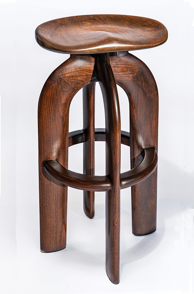 This is the epitome of my line of stools. It’s the result of months-long discussions and drawings with a client whom I never met. What I hadn’t anticipated was the amount of time it would take to shape the legs into ovals. From the floor to the seat, the base is nothing but ovals and compound curves that defied machine sanding. It took hundreds of hours to make the surface scratch free for the dark walnut stain. The oval shapes required twice the amount of wood as the regular legs and are made in three sections: hence the expense. The measurements are the same as my other barstools. The weight is another matter. The Chevalier stools weigh 23.4 lbs compared to 17.4 lbs. A less expensive version of this stool can be made by eliminating the ovals and building them like my other stools, with flat-sided legs. Contact me for further information.