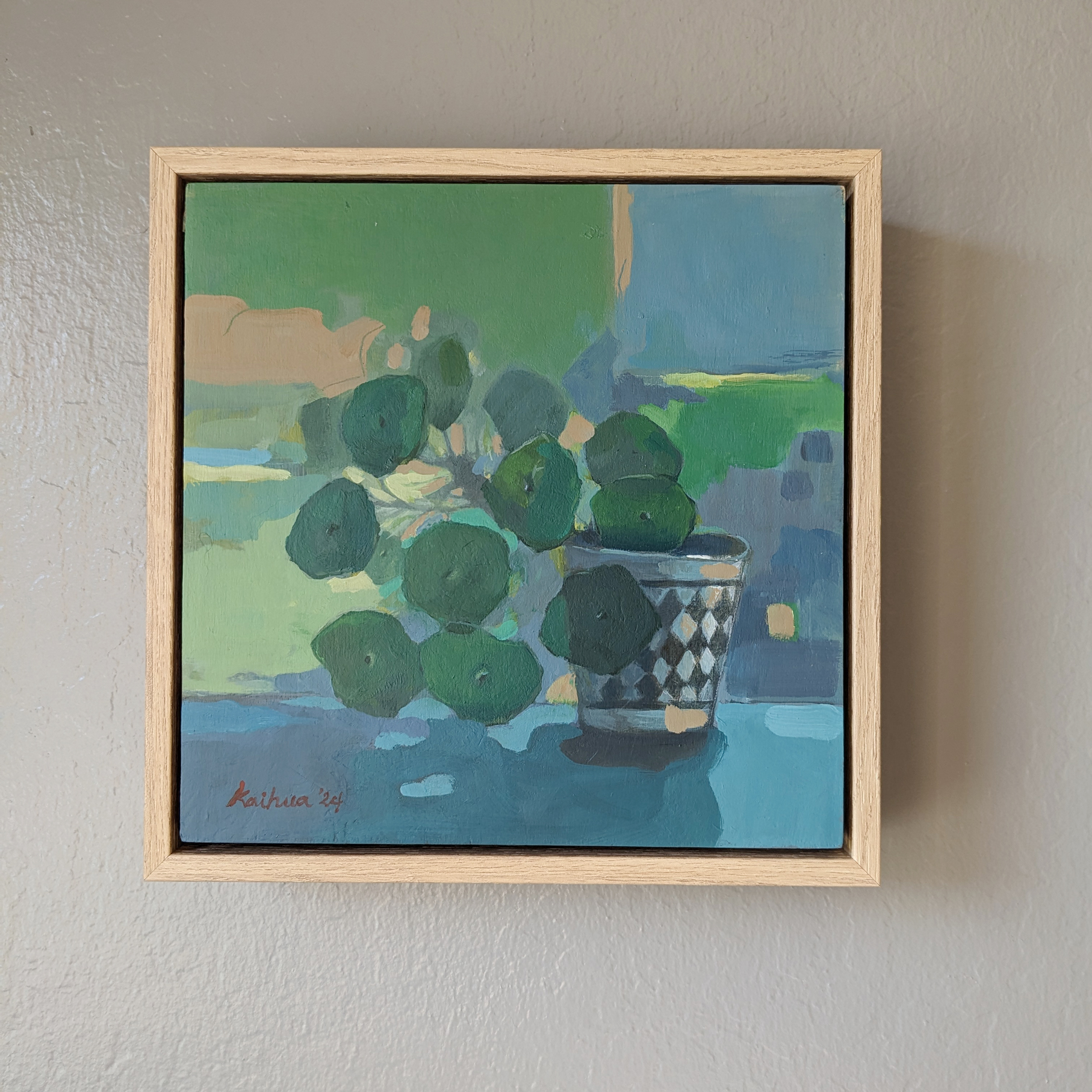 A Chinese money plant rendered with bold color blocks, balancing detail and abstraction to create dynamic contrast and depth.