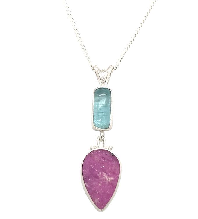 Cobalto-calcite and Apatite Pendant. Completely pink natural untreated stone I cut from an old collection. Druzy crystals shimmer pink and comes from Congo. Blue apatite comes from Madagascar. Set in fine silver bezels with sterling silver components and 18” chain included. I cut these stones to complement Earrings made in same materials.