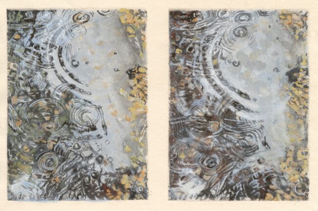 Mineral Pigments over photopolymer photogravure print. 13″ 13″ print floated in a 15″ x 15″ natural wood frame
