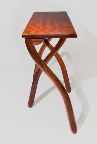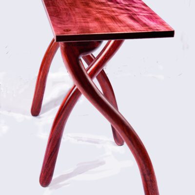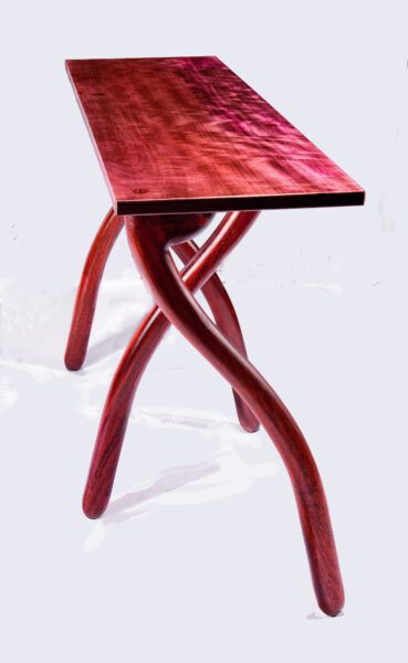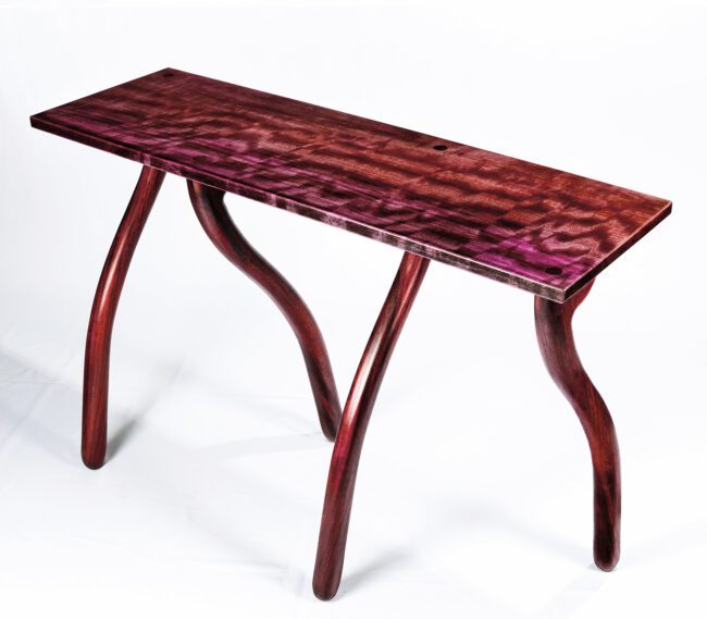 I was browsing in store that caters to woodworkers when I saw this spectacular piece of wood: flawless, flat, wide enough for a table and outrageously, blatantly purple. Its other quality was its figure that shimmered in the light. I brought it home and thought about it for a year. I knew I would give it walking legs, but how, this time? As long as the four feet touched the ground, did it matter? What would happen if the legs pointed out instead of lengthwise? That’s what I did and this is the result. I was warned the purple would morph to brown and it did. It turned into a lovely pinkish brown that pops under a bright overhead light. 30″H x 43″W x 13.5″D, purpleheart top and padouk legs. 1st place in Woodworking at the 2019 California State Fair and Judges’ Choice, 2nd place in Sculpture at the 2020 virtual Beverly Hills Garden Art Show. It’s still available.