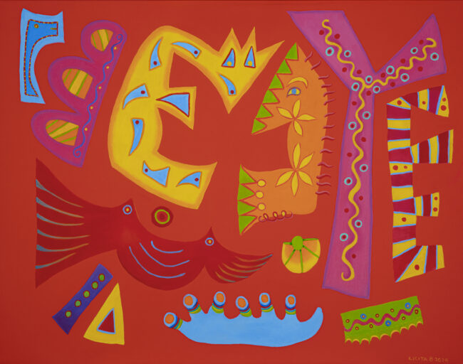 Danza De Los Alebrijes (Dance of the Alebrijes) is a 22″x28″ acrylic and oil painting, part of my Alebrije Inspired series. Alebrijes (ah-lay-bree-heys) are vibrantly colored, intricately hand-painted sculptures of animals, people, objects, or fantastical creatures. They are made from wood or papier mache. This Mexican folk art originated in Mexico City, but Oaxaca City, in the state of Oaxaca, is now considered the epicenter for alebrijes.