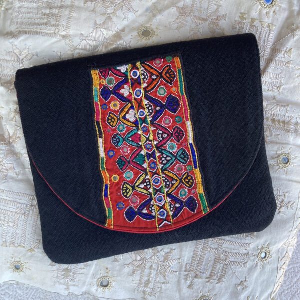 From my “Date Bag” series, this has a delicate strip of antique mirror cloth from the Kutch desert area of India, immediately south of Pakistan. The red lining has three contrasting inner pockets. Corded bag is 9′ x 7.5″