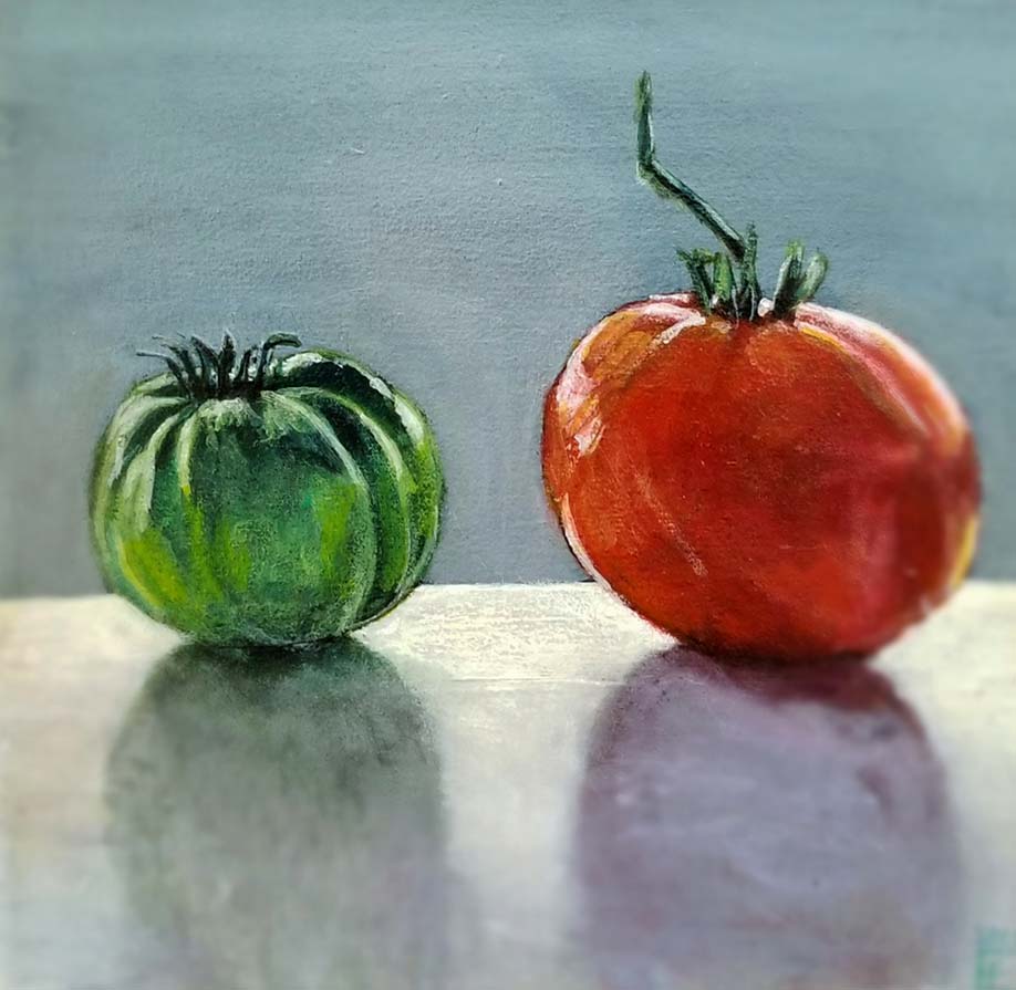 Two tomatoes rest on a windowsill. I loved painting this quiet moment. Something about it made me smile.