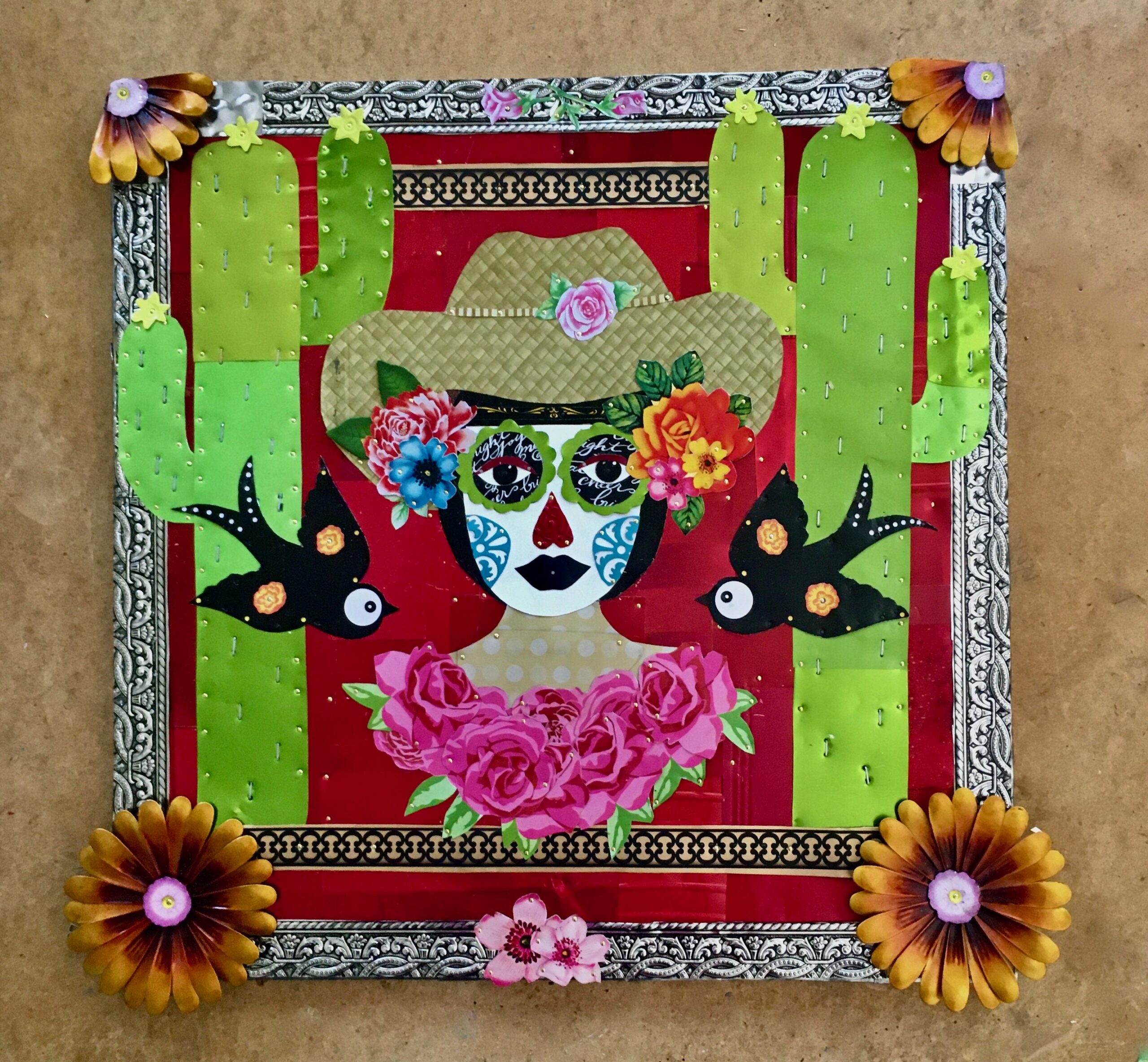 This piece was made using recycled cookie tins and aluminum water bottles. All pieces have been cut and nailed by hand and this is all made from original tins – not painting involved!