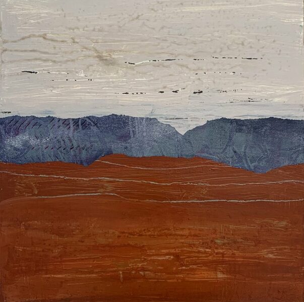 A 12″ x 12″ abstract landscape using acrylics and collage on a cradled wood panel. Framed in a wooden floater frame.