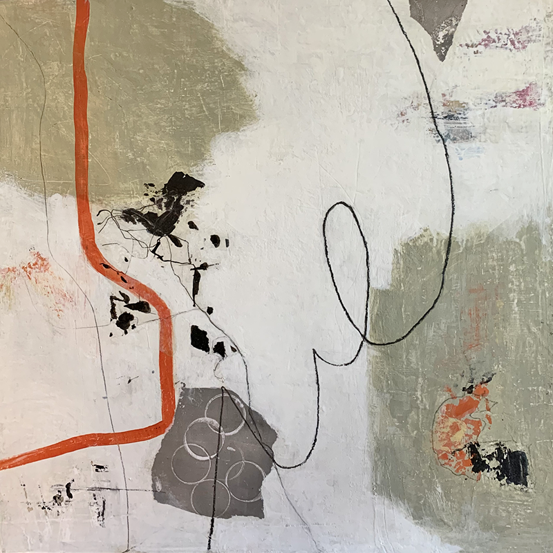 An abstract painting using acrylic paint and collage on a cradled wood panel. Sides painted black. Size: 20″ x 20″.