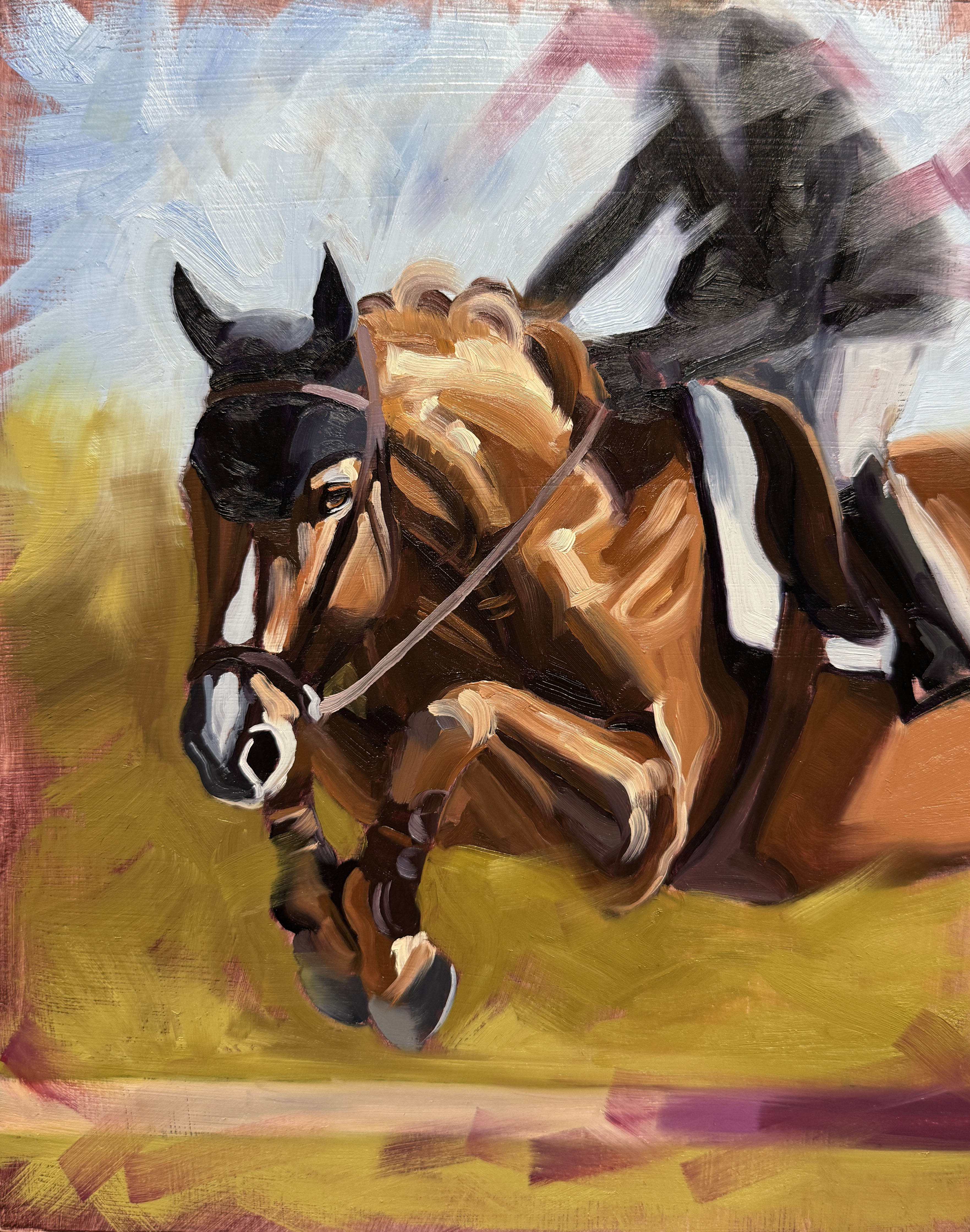 A showjumping horse painted alla prima with bold brush strokes and a vibrant purple underpainting that shines through. This painting was featured in the “Let the Fur and Feathers Fly” juried exhibition at the Crockett Gallery in 2025.