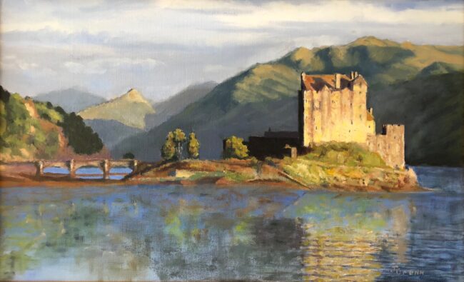 The Donan Castle. I went to Dublin to see the lost painting, The Taking of Christ. On our first day, we went for a walk in the center of town. I noticed a postcard that morning that lit me up like a light bulb. It was one of a castle. So I handed it to my wife and she bought it with a few others. When we got back to the hotel, she looked at the back and noticed that the castle was the family castle of my good friend, Scotty Elrod. So, of course, I had to paint it. Most experts say you cannot paint from a photograph. because the photos don’t have the feeling of being on location live. But if you paint from the photo playing a musical piece like the Brandenburg Concerto, by Mozart, interpreting it in your own style, it can work out pretty well.