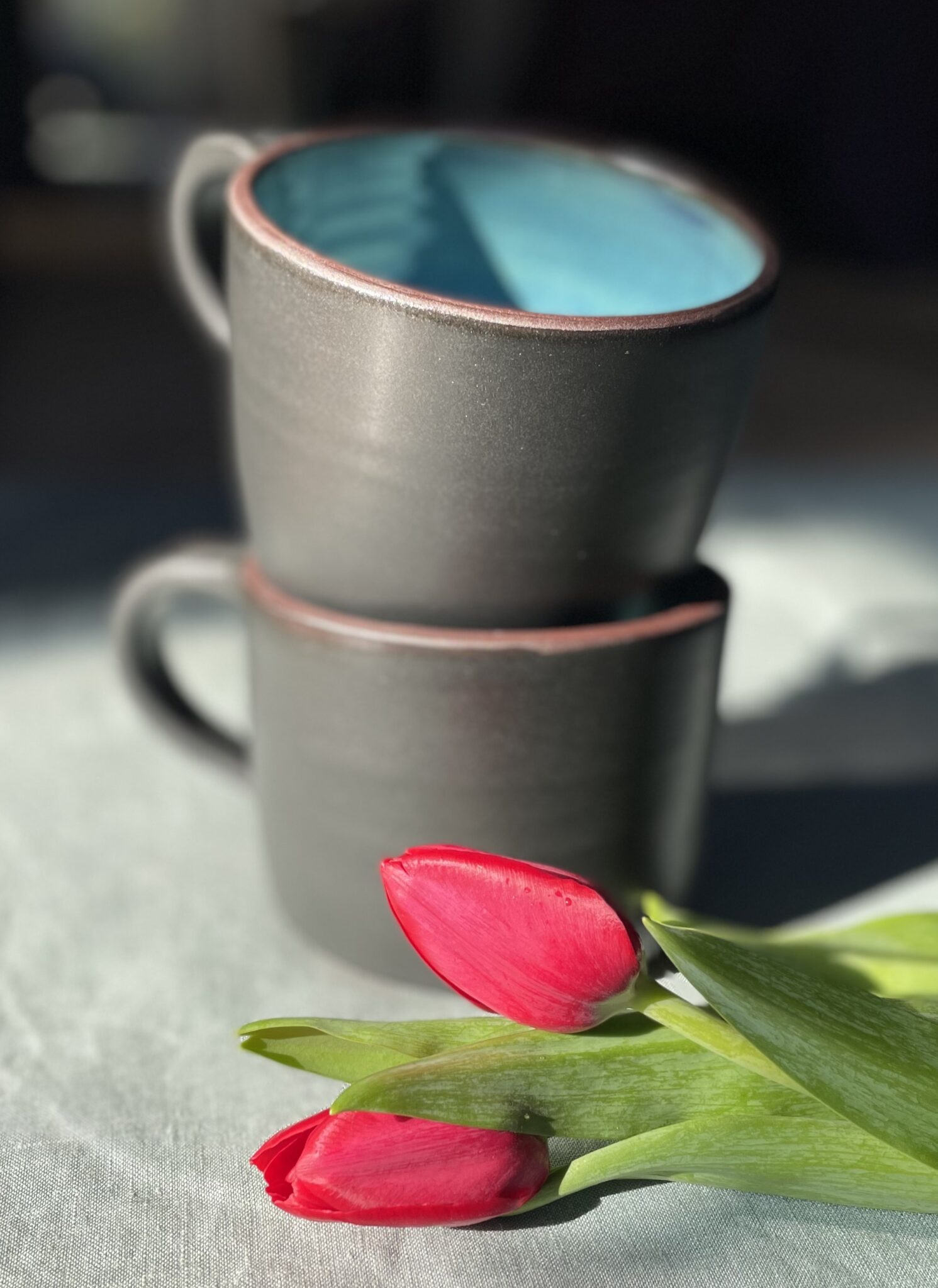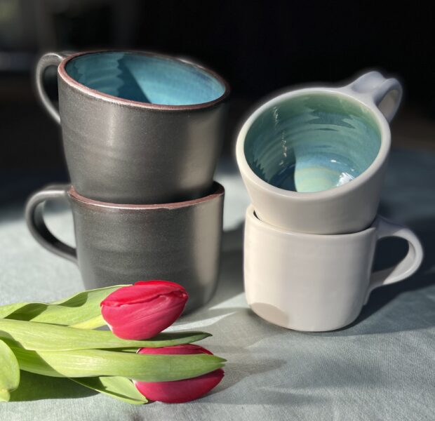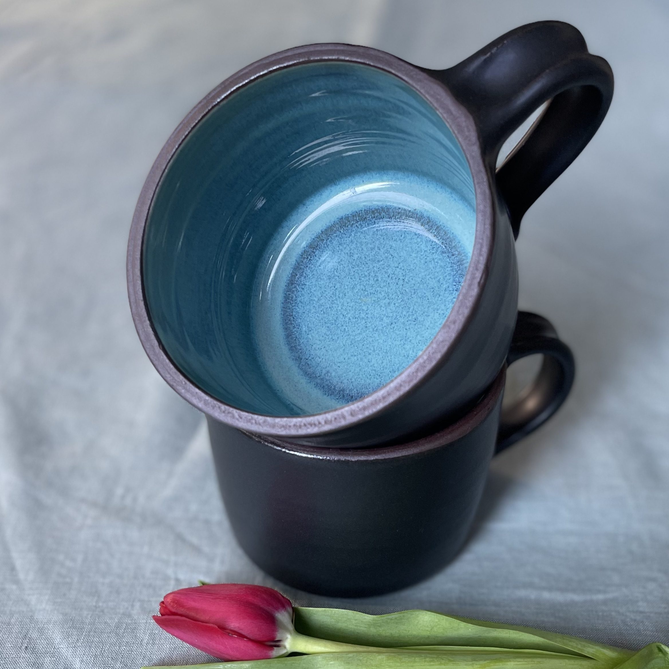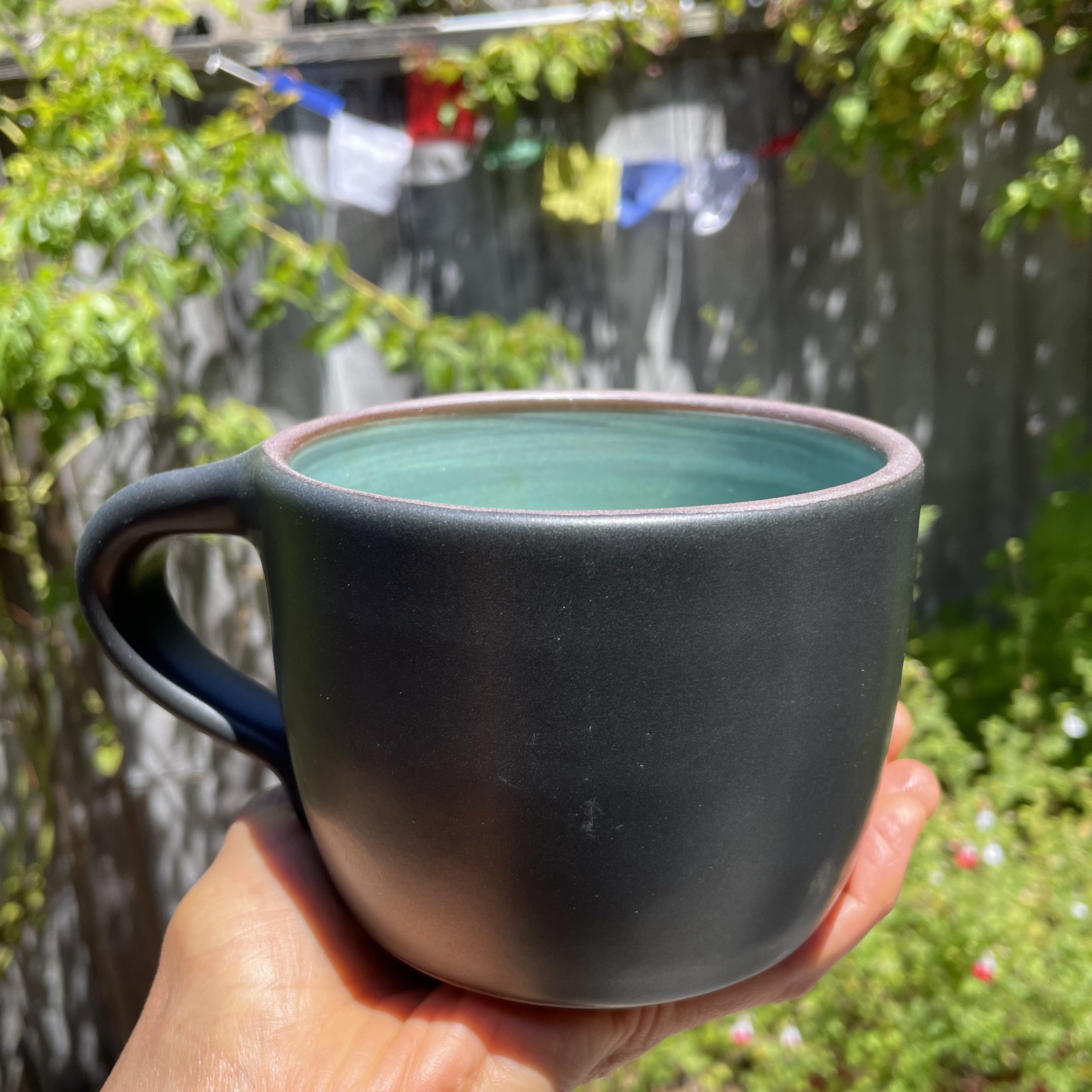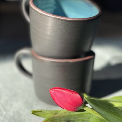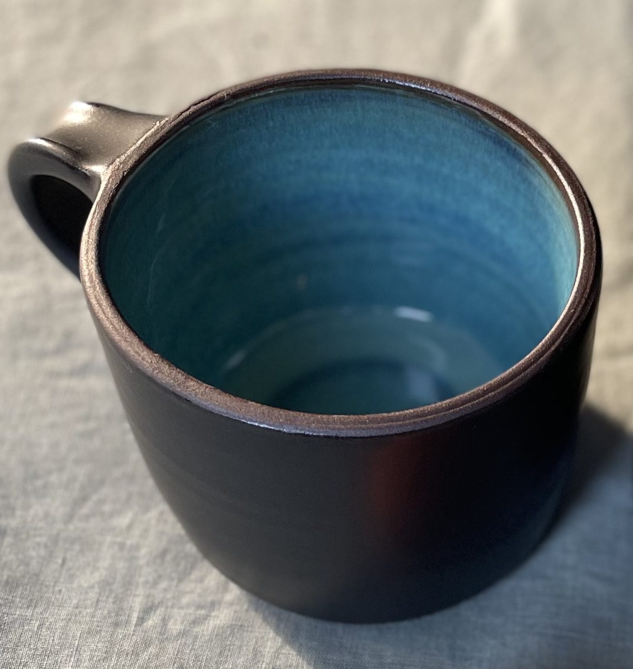 This extra large coffee mug was thrown on the wheel using red clay. First I made the base and then after some drying time, I pulled the handle off the top of the mug and attached it to the base. This gives the entire form a lovely, organic, handmade touch. The interior is glazed turquoise to make a nice contrast with a matte black on the outside.