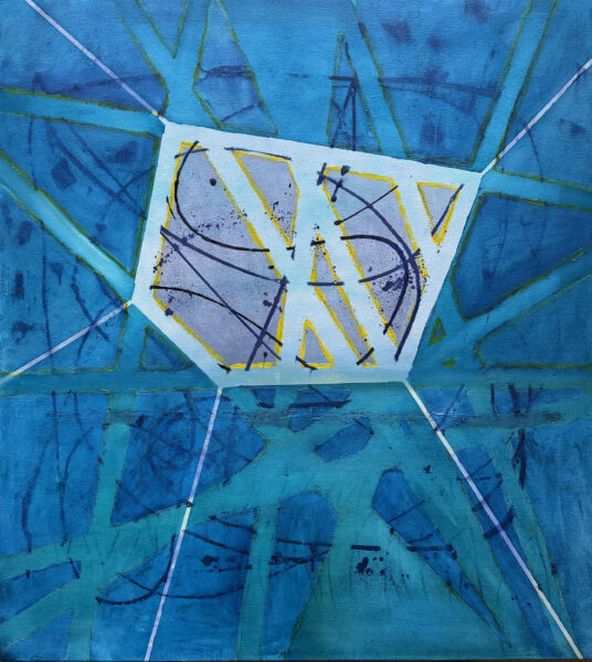 Oil on canvas, 40″ x 36″. This painting explores the idea of simultaneous levels of perception, uncovering the hidden realms of chaotic swirling beneath our everyday visual experiences. The forces opposing rigid structures and false certainties can find balance even amidst the chaos.