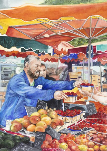 A farmer’s market in the South of France. A farmer is selling a box of strawberries to a woman.
