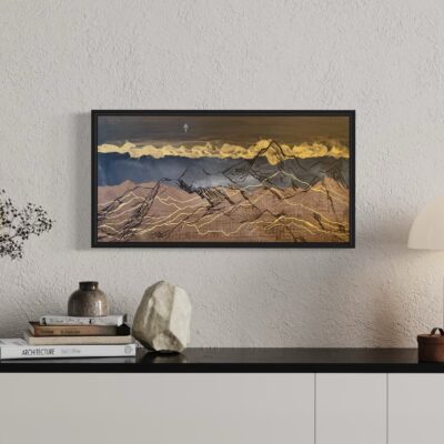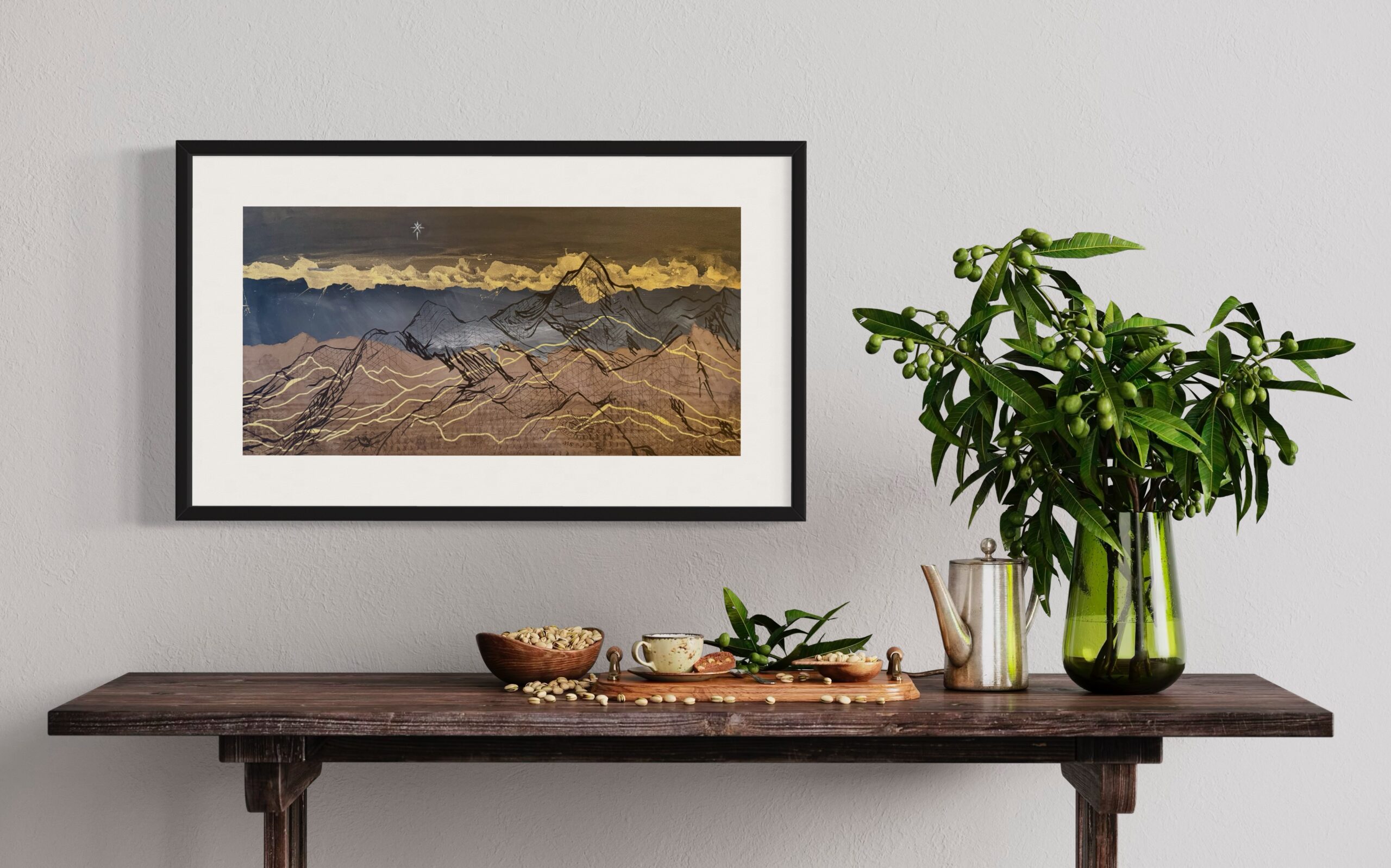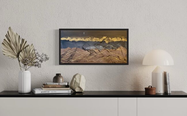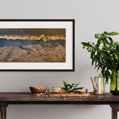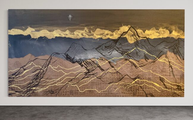 For this piece, I decided to repurpose an old “experiment”, keeping the half of it I loved and fully revamping the rest. As the work evolved, it became layers of mountain ranges with an underlying cartography and topography feel. So I decided to fully lean in, integrating a compass rose pointing to Polaris, the North Star.