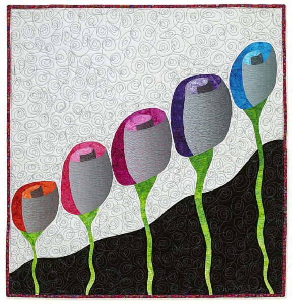 Oversized new buds in bright colors delight the eye as they are beginning to open. The outside of the petals highlight the inside buds with a touch of color on a light-to-shadow gray that leads the eye around as it begins to unfurl.