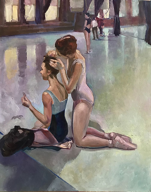During class, two ballerinas stopped to fix the others hair into it’s chignon…….standard ballet bun head.