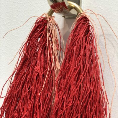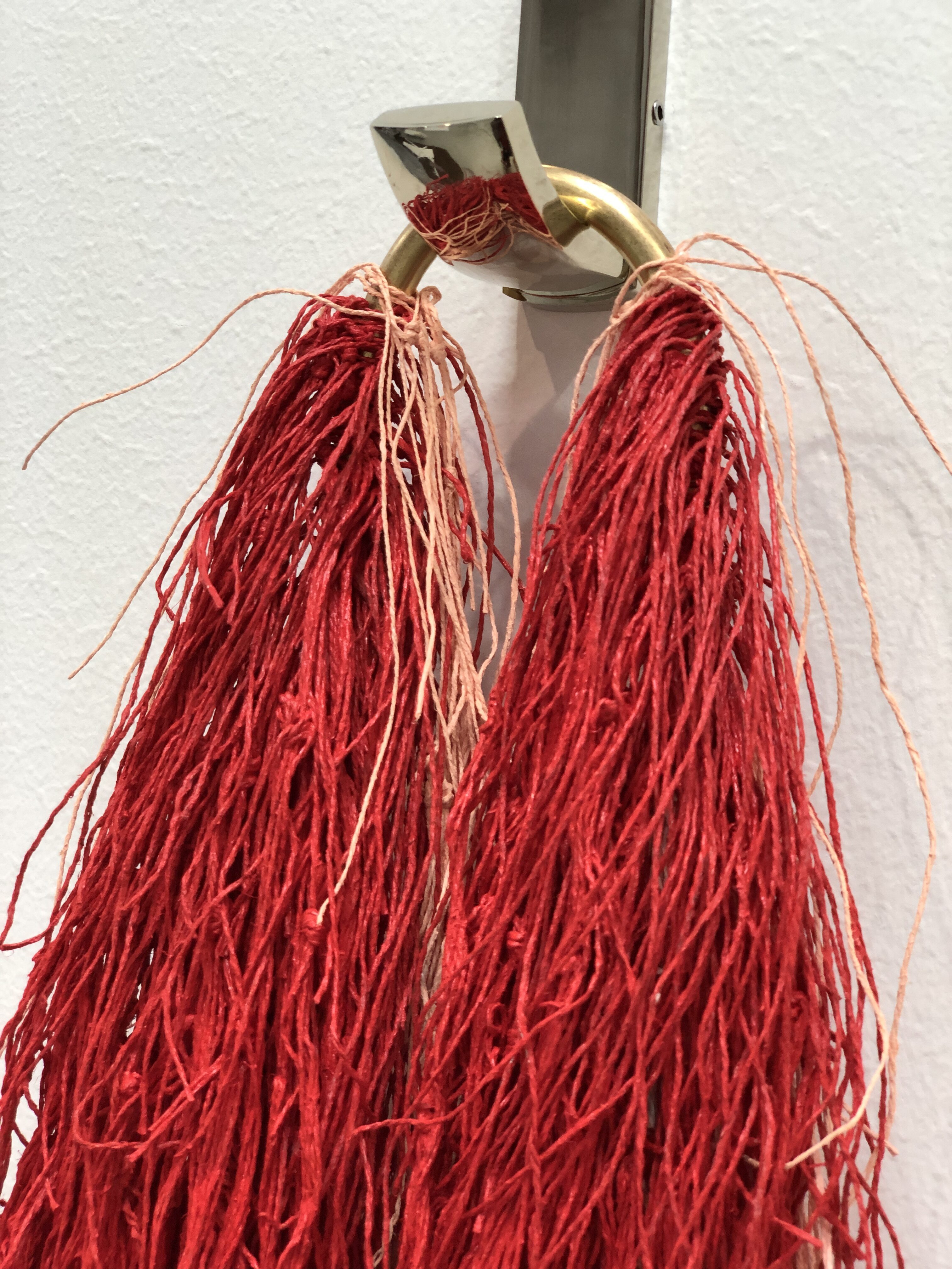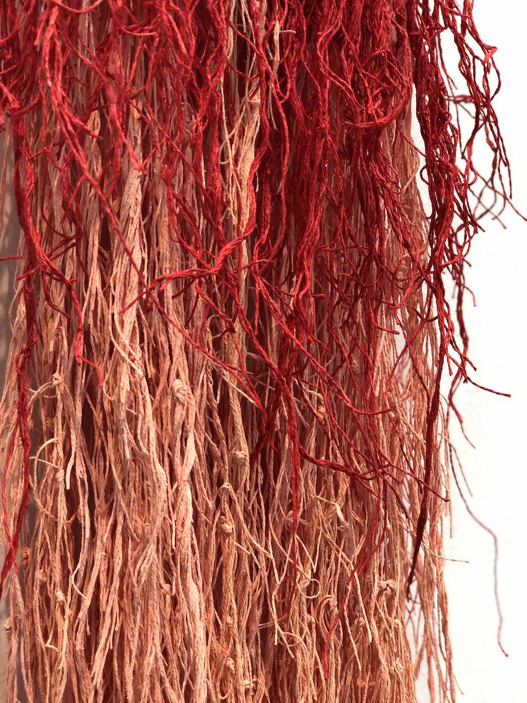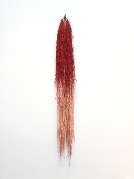 Linked together through a series of basic knots, these works reference the simplicity of bringing disparate elements together through the act of knot tying–a practice both universal and historical, linking humankind together through space and time. Orderly tangles of painted thread mirror organic root structures and remind us of generative creation and the basic physical structures of life.