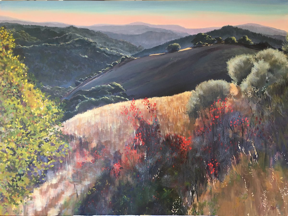 From Now To The Other Side was painted in 2022 and won an Honorable Mention at Marin Museum of Contempoary Art 2022 Members show. It’s large at 36″ X 48″, painted with many layers of acrylic paint. The inspiration for this painting is hiking in the hills around my Fairfax, CA home.