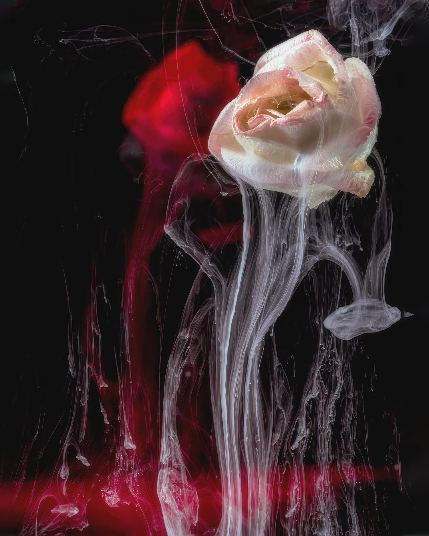 Image of a white camellia photographed underwater in an aquarium with paint added to the water. This set up had a red reflective sheet behind the tank which shows the back of the flower and some of the paint. Available as a matted 8 x 10 print at $40, 11×14 metal print, $150, 16×20 metal print for $250. Other sizes and media on request, archival paper, acrylic, canvas, and metal.