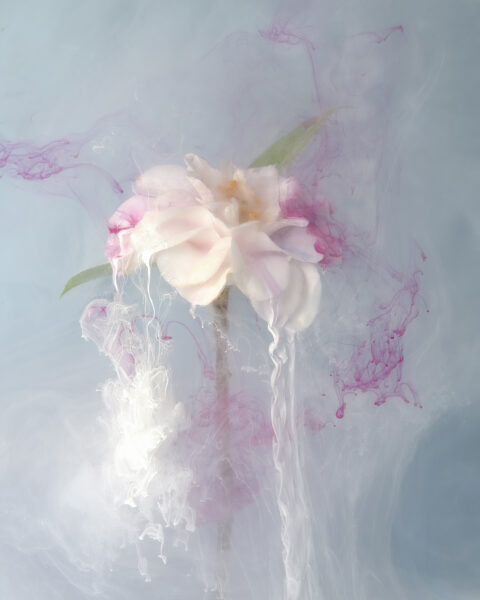 Image of a camellia photographed underwater in an aquarium with white, purple and a blue paint added to the water. Available as a matted 8 x 10 print at $40, 11×14 metal print, $150, 16×20 metal print for $250. Other sizes and media on request, archival paper, acrylic, canvas, and metal.