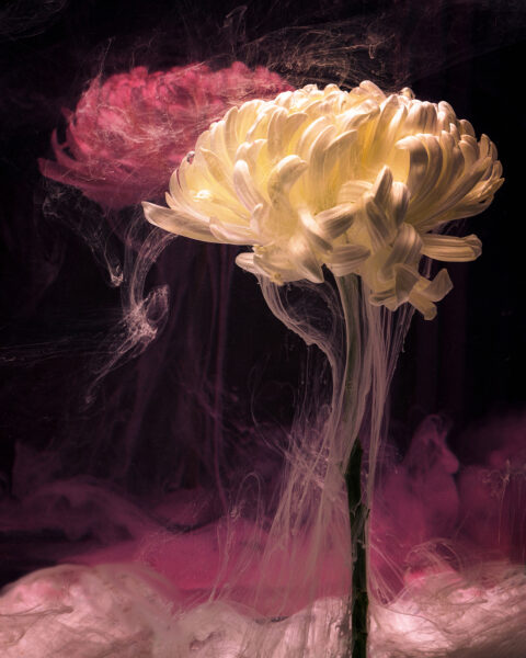 Image of a white mum photographed underwater in an aquarium with white paint added to the water. A pink reflective sheet was behind the tank showing the back of the fower and a link of the paint in pink. Available as a matted 8 x 10 print at $40, 11×14 metal print, $150, 16×20 metal print for $250. Other sizes and media on request, archival paper, acrylic, canvas, and metal.