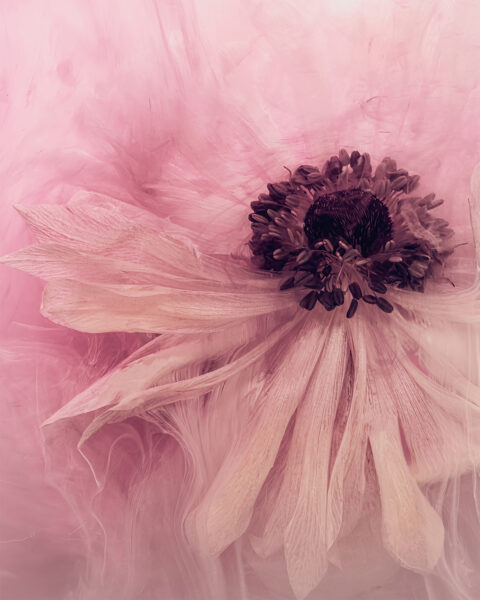 Dreams meant as both a noun and a verb. This is an image of a pink anemone surrounded by a swirl of pink paint. Available as a matted 8 x 10 print at $40, 11×14 metal print, $150, 16×20 metal print for $250. Other sizes and media on request, archival paper, acrylic, canvas, and metal.