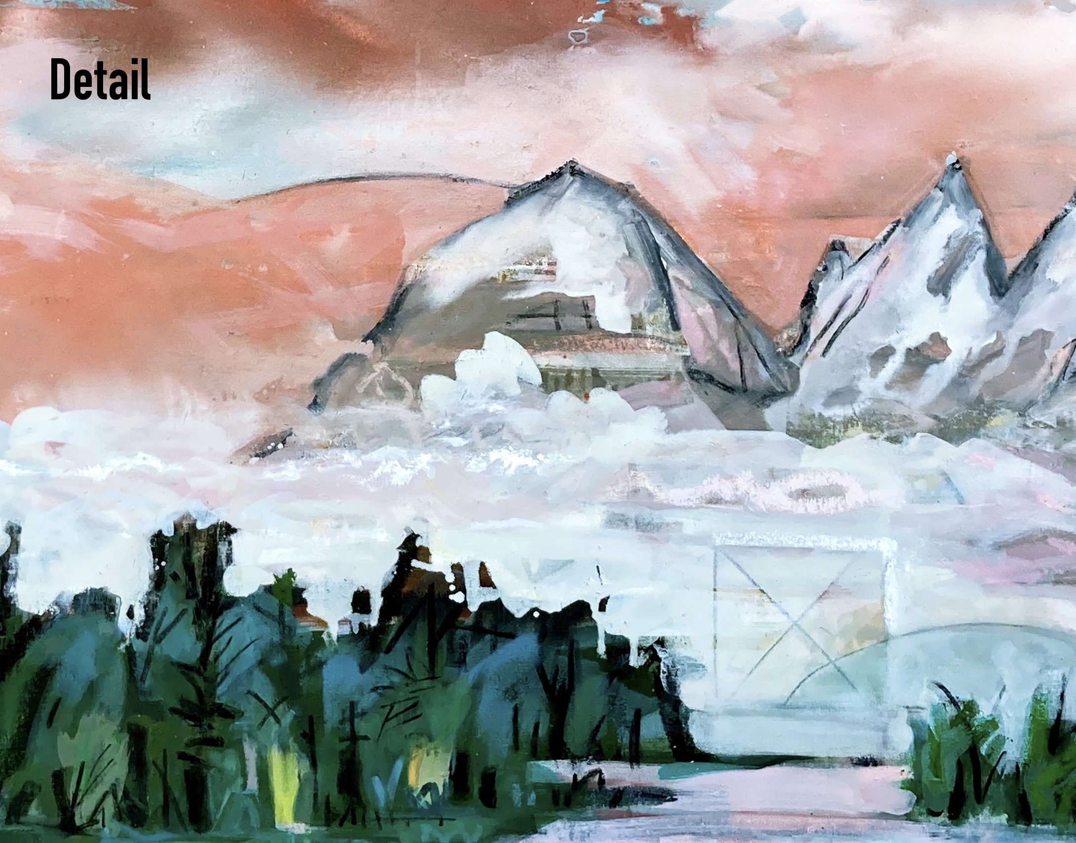 Oil and charcoal on canvas on panel. 48h x 48w inches. No frame required. Signed on left edge.