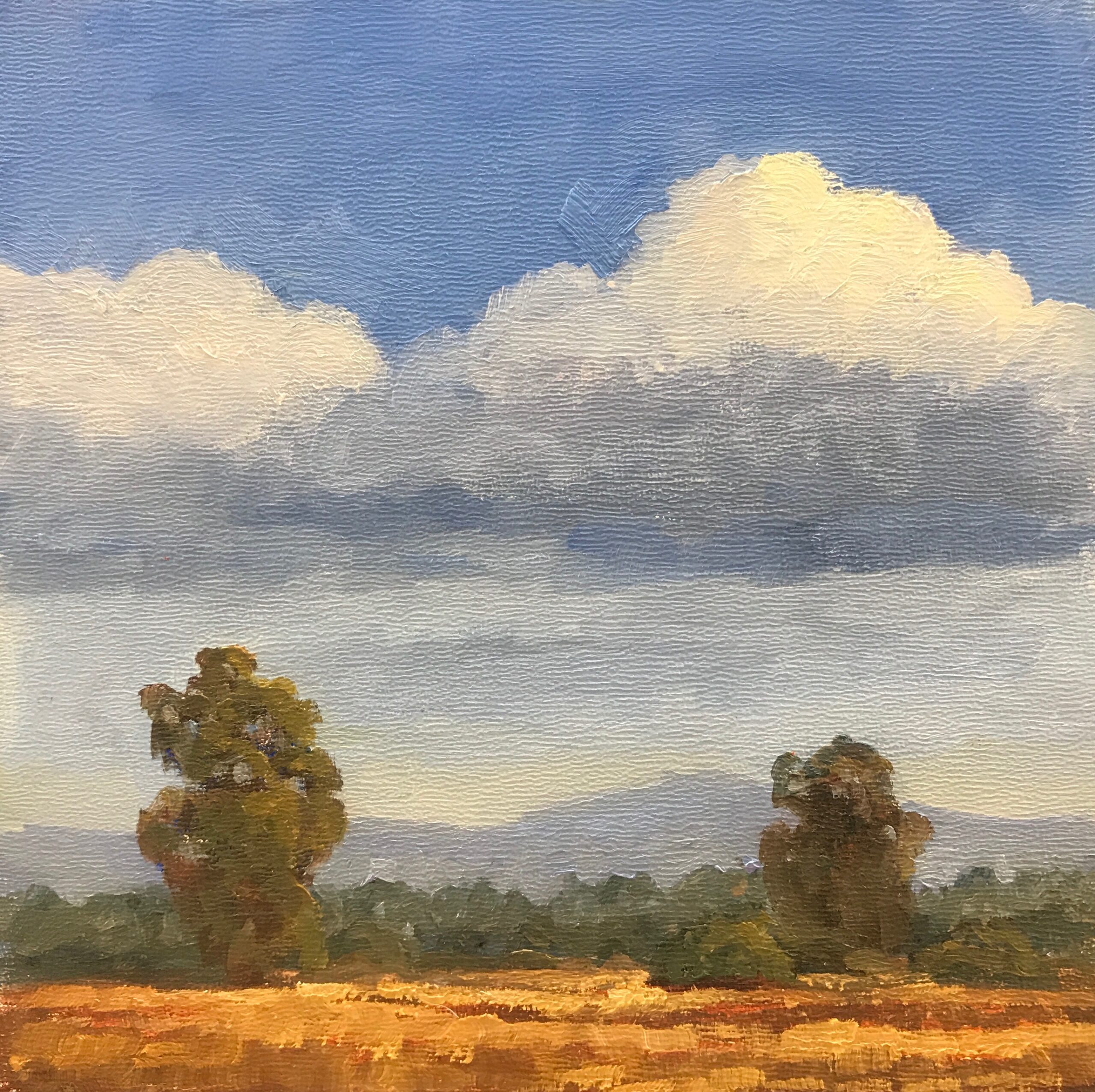 It is an 8×8″ oil painting of a view from Smith Ranch Road.It is framed with a black and gold frame.