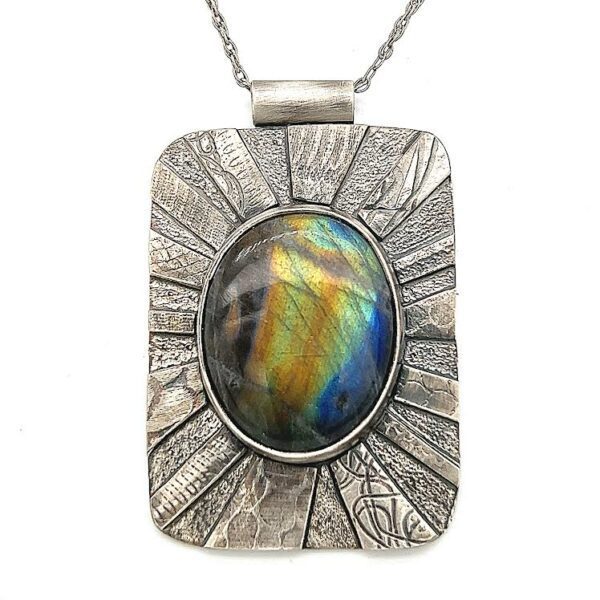 Gem Labradorite and Textured Silver Pendant. I cut this really bright Labradorite from Scandinavia and love the intricate pattern and colors. Added a large textured metal collage and hand textured areas with sparkle cuts from a diamond. Fine silver bezel and sterling silver 18” chain included.