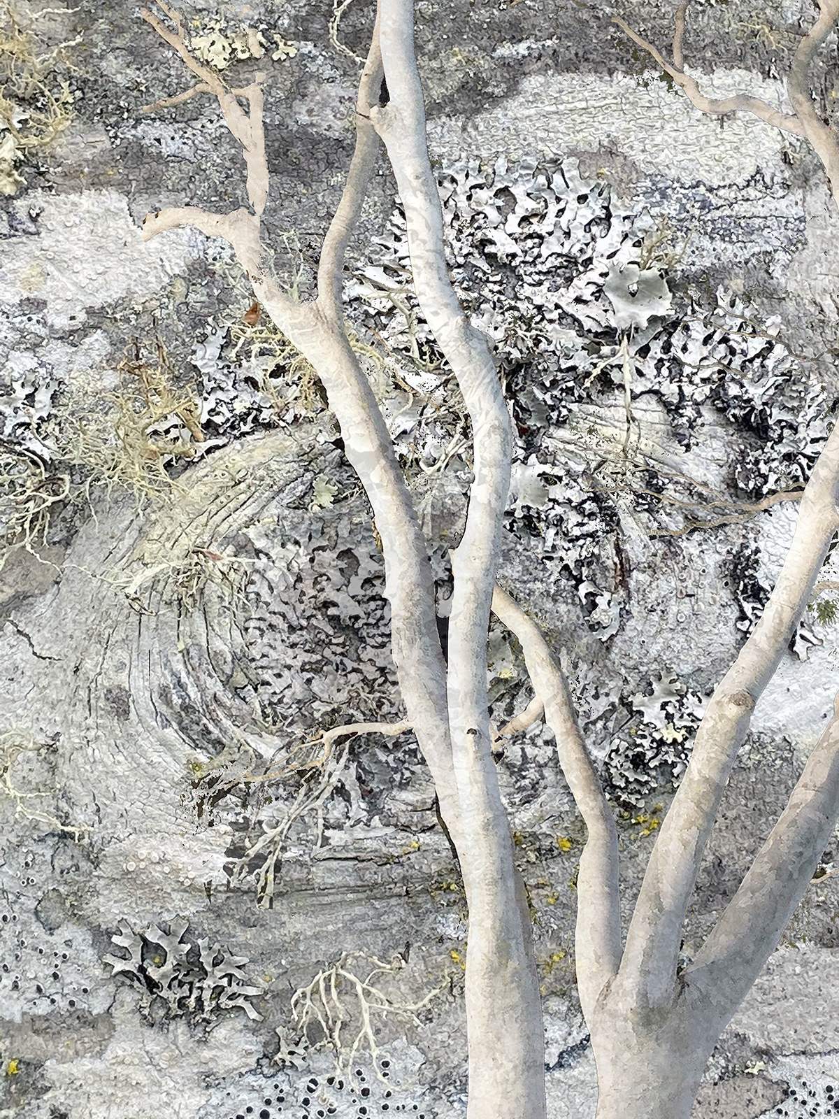 These original, limited edition of 10, inkjet prints on archival paper combine a mélange of background imagery with photos of the Australian Ghost Gum which is a stunningly white fast-growing tree that can add up to 3 feet to its height each season. As is the case in his series, my process often includes recycling past work into new art.