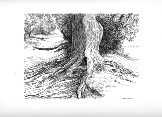 Another view near the West end of Golden Gate Park showing the exposed roots of a tree and the trail beyond.