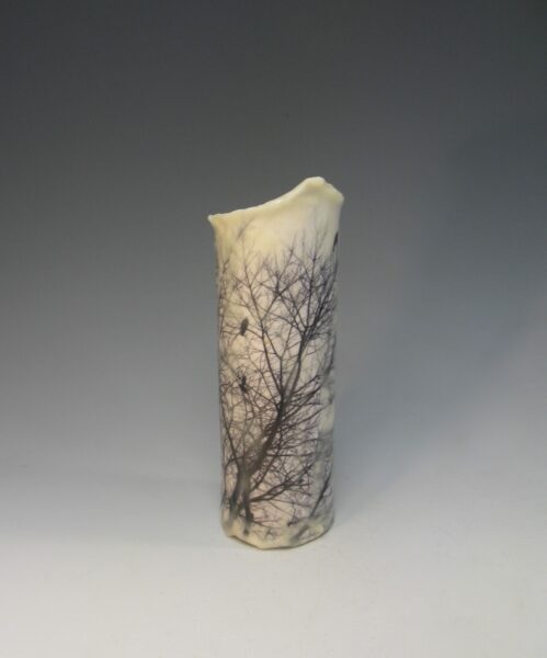 this piece is hand built glazed and fired. after a glaze firing my original photograph is attached and encaustic medium is added in many layers to create a mixed media vessel