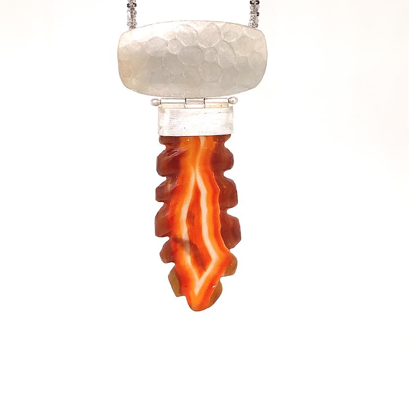 Carved Laguna Lace Agate pendant set in fine and sterling silver. The agate was sliced from a top gem geode and hand carved with an organic design. Textured sterling silver bangle compliments the organic form. Rhodium plated silver chain is included and will not tarnish.