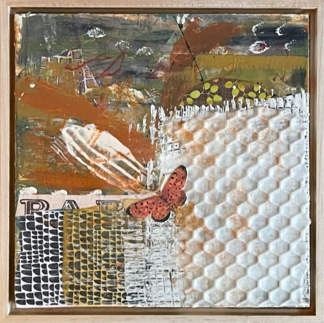 Mixed Media on wood panel; paint, paper, textured honeycomb fabric, and touches of glitter in a floating frame 11″ x 11″.
